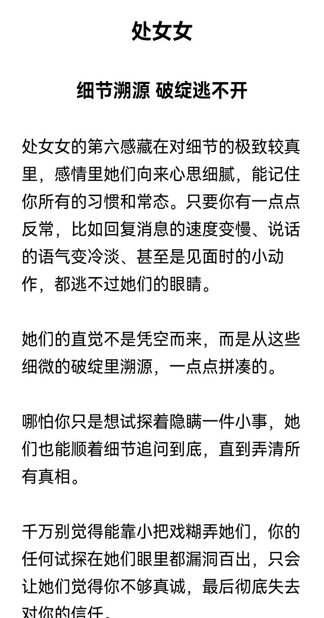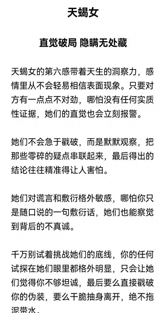 天蝎座的知骁勇像雷达,你略微有点不合劲,她就能顺着蛛丝马迹挖出真相。